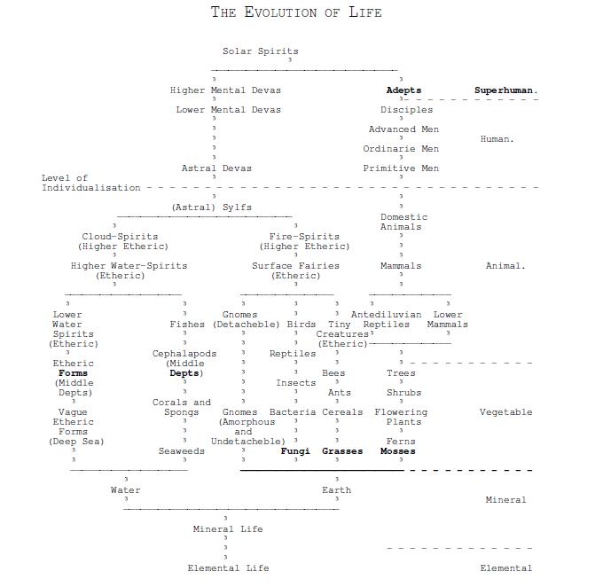 The table of the evolution of life, appended here, shows the streams as flowing side by side as far as the mineral kingdom, but as soon as the upward arc is begun, they diverge. The streams re-unite at the Solar Spirits level. The table must not be considered as in any way exhaustive, as there are no doubt other lines which have not yet been observed, and there are also certainly all kinds of variations and possibilities of crossing at different levels from one line to another. The table is designed merely to give a broad outline of the scheme.